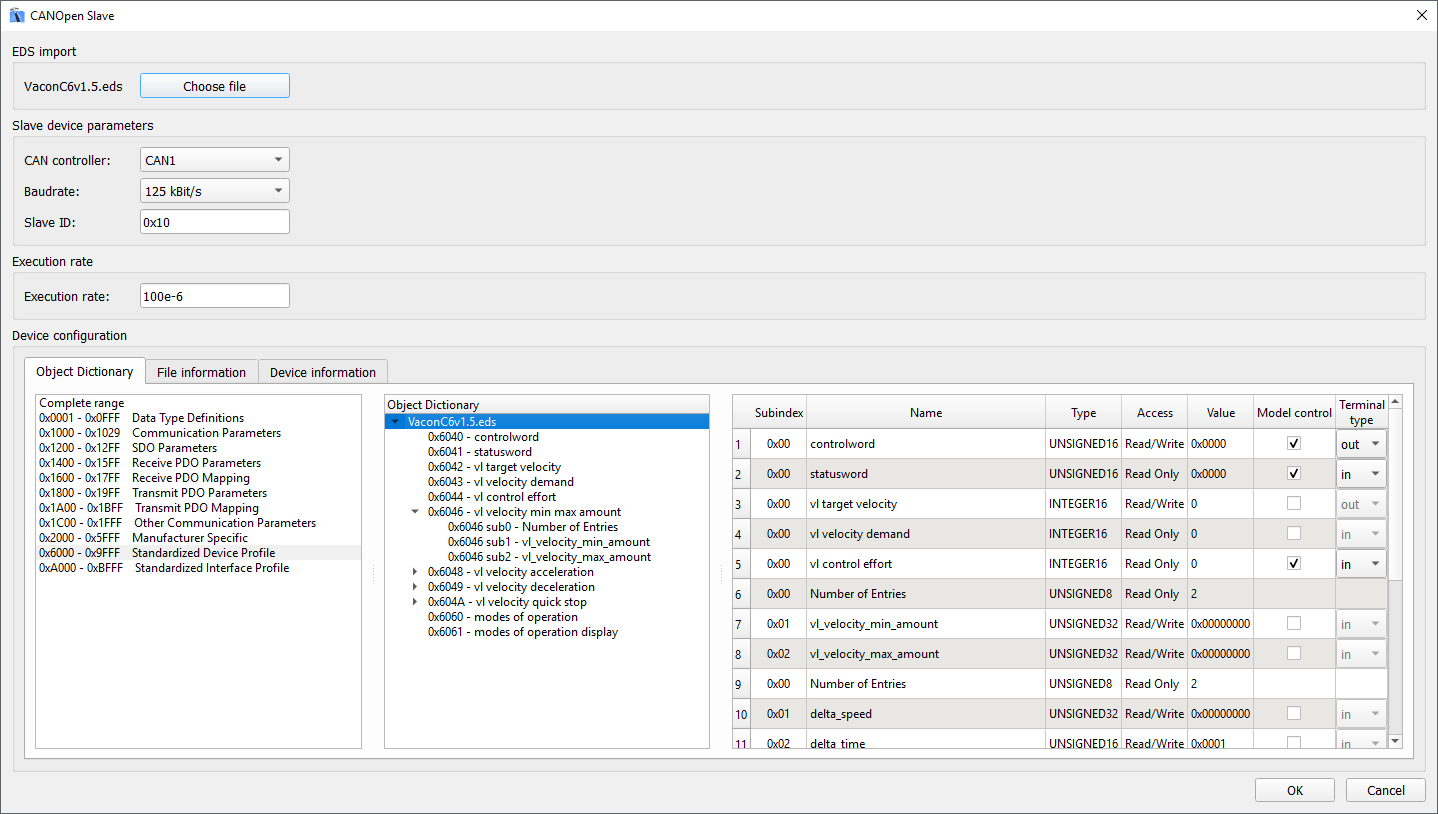 The Model control column defines if the value for a specific dictionary object will be controlled using the signal from the model. If this field is enabled, a terminal will be created on the component that can be used to connect any Signal Processing signal to that object. The direction of the terminal is defined using the Terminal type field. The Model control field is only available for dictionary objects in range from 0x2000 to 0x9FFF.
