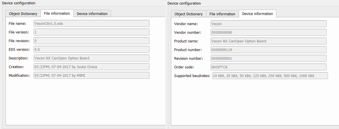Once the configuration is selected, the Baudrate combo-box and Slave ID value will be populated with the values from the configuration. The Device configuration part of the dialog window will be populated with the table representing the Object Directory (OD) of the Slave device. This is shown on the Figure 6.