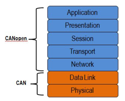 In terms of the OSI communication systems model, CAN covers the first two levels: the physical layer and the data link layer. CANopen covers the top five layers (Figure 1): network (addressing, routing), transport (end-to-end reliability), session (synchronization), presentation (data encoded in standard way, data representation), and application. The application layer describes how to configure, transfer, and synchronize CANopen devices.