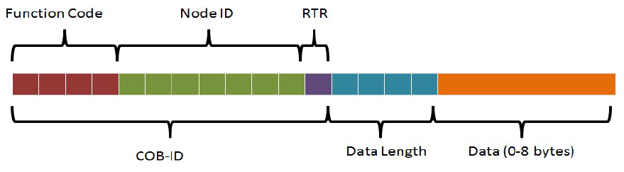 The message format for a CANopen frame is based on the CAN frame format. In the CAN protocol, the data is transferred in frames consisting of an 11-bit or 29-bit CAN-ID, control bits such as the remote transfer bit (RTR), start bit and 4-bit data length field, and 0 to 8 bytes of data. The COB-ID, commonly referred to in CANopen, consists of the CAN-ID and the control bits. In CANopen, the 11-bit CAN ID is split into two parts: a 4-bit function code and a 7-bit CANopen node ID. The 7-bit size limitation restricts the amount of devices on a CANopen network to 127 nodes.
