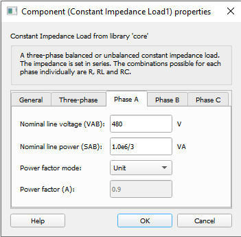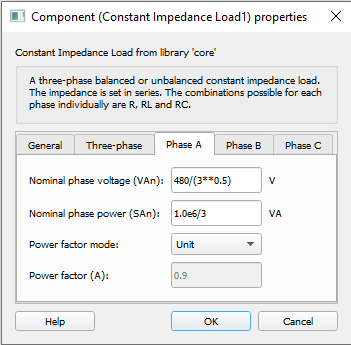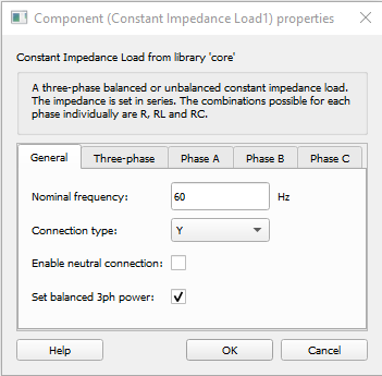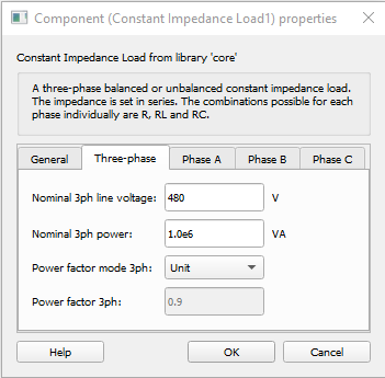 Description of the Constant Impedance Load component, for representing a three-phase balanced or unbalanced constant impedance load.