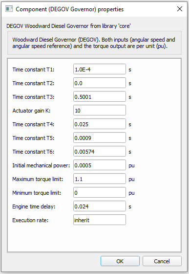 The DEGOV Governor model is a standard model for diesel engine governors, usually used in power system simulation studies. It is often used in transient modeling of diesel electric generators. A block diagram of the DEGOV Woodward Diesel Governor component is shown in Figure 2, where you can find equations for the transfer functions used in the model.