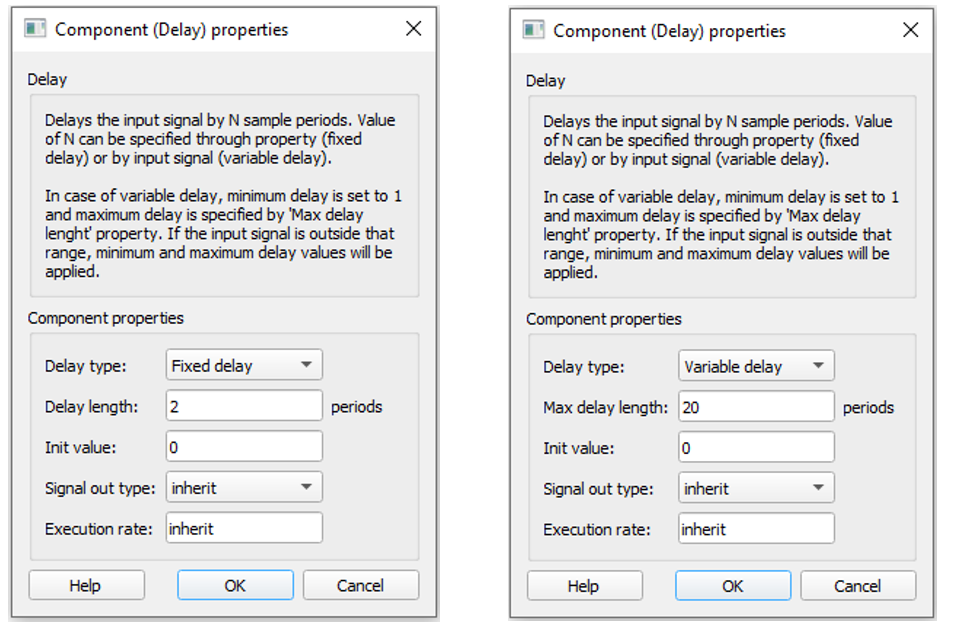- Select the delay type. If Fixed delay is selected, the input signal will be delayed by Delay length sample steps. If Variable delay is selected, the input signal determines the delay value