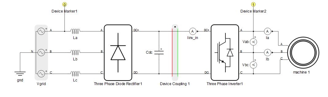 An example of a HIL marker use case is shown in Figure 2. Device coupling is used to divide the full circuit into two separate circuits that should be emulated on two separate HIL devices. Device markers are used to define which part is emulated on which HIL. The rectifier part is marked with a marker set to ID=0, meaning that it is going to be emulated on the HIL with ID0. The inverter and machine part of the circuit is marked with a marker set to ID=1, so it is going to be emulated on the HIL with ID1.