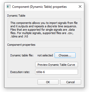 - The Dynamic Table component can only import files with up to 5 million data points. The number of data points is calculated as: number of signals * time points in the "Time column".