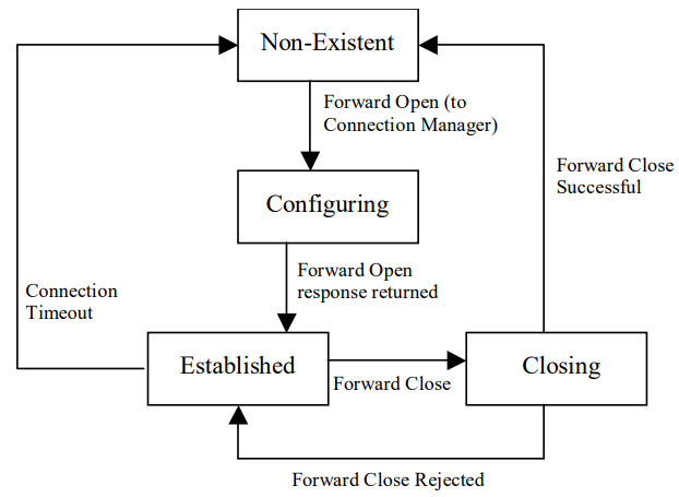 - Forward Close (0x4E) - used to terminate an existing communication connection between devices. It allows devices to release resources associated with the connection when it is no longer needed.