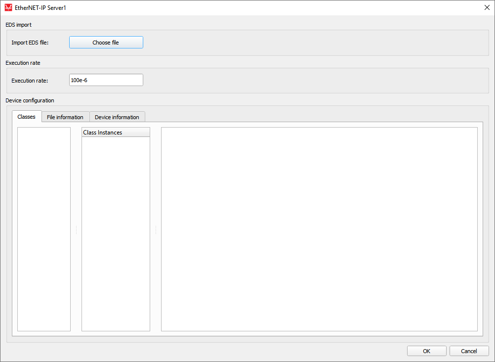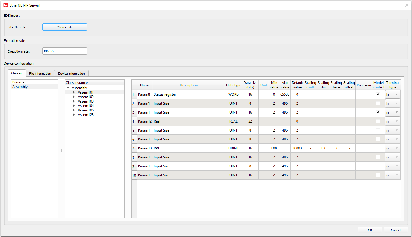 When loading the EDS file, both Parameter classes and Assembly classes are extracted. For each instance, the attributes that describe them are displayed in the tables. Each assembly parameter represents a potential terminal for which a direction can be selected. The Model control column defines if the value for a specific object will be controlled using the signal from the model. If this field is enabled, a terminal will be created on the component that can be used to connect any Signal Processing signal to that object. Depending on the choice from Terminal type column, a port appears as an input or output terminal on the component. File information and Device information tabs (Figure 7) present some basic info parsed from the EDS file.