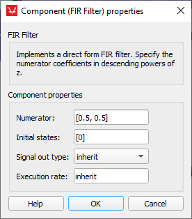 - Choose the type of the output signal of the component. This property can be set to “real”, “int”, “uint”, or “inherit”.