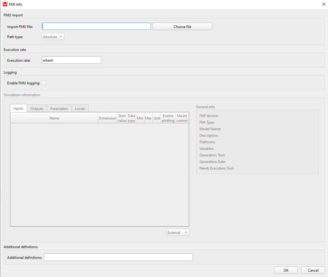 If the FMU file is parsed correctly, the table will be updated from the variables extracted from the file. General info field will also be filled with the information from FMU file. The example of dialog window, once the FMU file is imported is illustrated below.