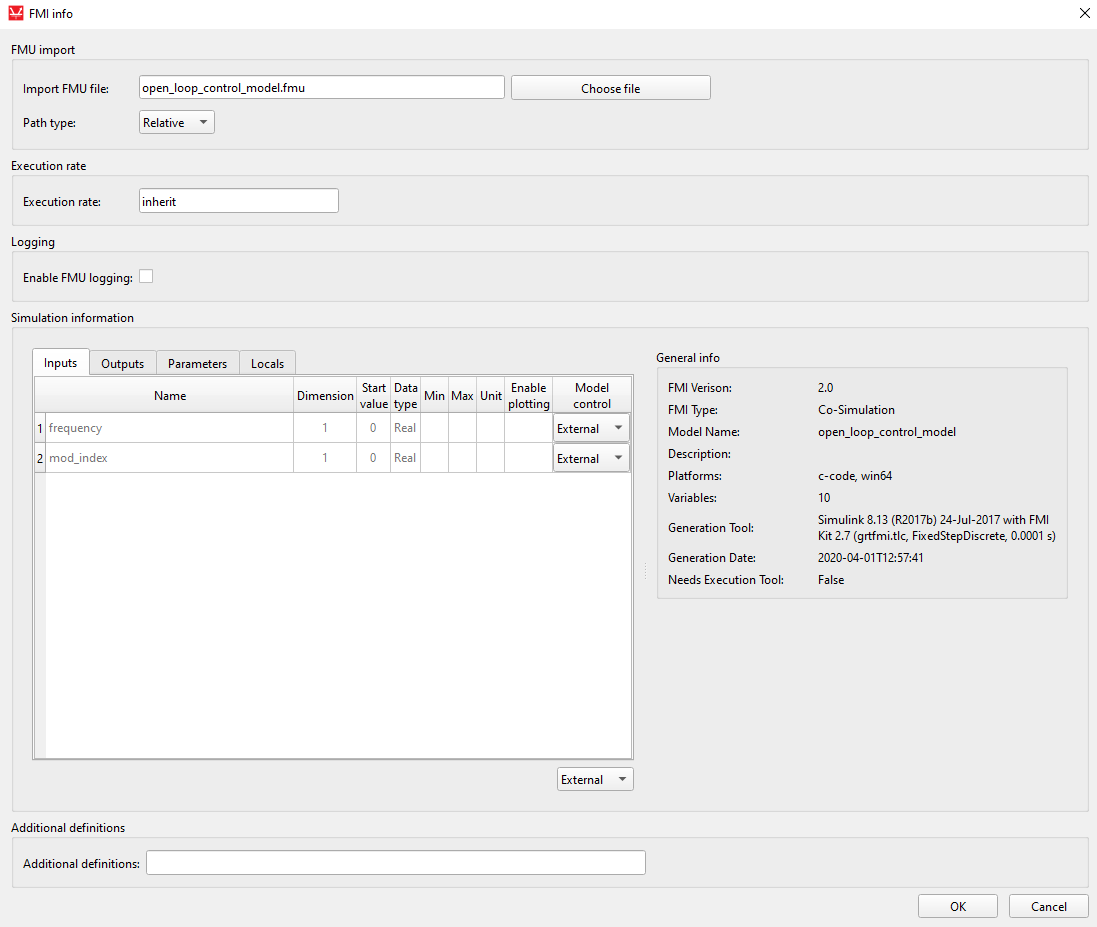 - Inputs – these are the input values for the FMU Slave. If Model control combo box is set to External, an input terminal will be created on the component that allows the user to connect the desired signal to this variable. By default, all Inputs are set to External. In this case, the Start value will be ignored and the value of the connected signal will be used. If Model control is set to Constant, the terminal will not be connected and the Start value will be used as the variable value. The Start value can be changed if Model control is set to Constant.