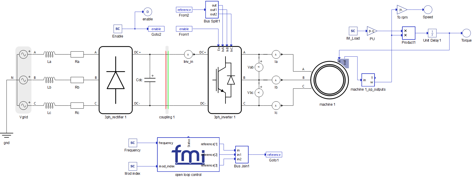 The use of the FMU Import component will be illustrated on the Induction Machine Open Loop Control example model (examples\models\how-to examples\FMU import\fmu import.tse).