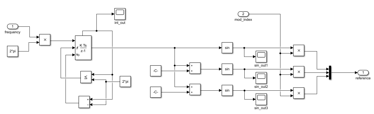 Open loop control is designed using the FMU Import component and it is located on the bottom of the schematic. There are two inputs and one output of this control. The inputs are Frequency and Modulation index and the output is the reference signal for 3 phase rectifier. The same control is previously created in MATLAB Simulink (Figure 8).