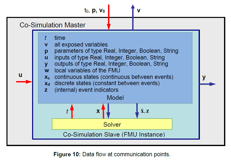 - FMI for Co-Simulation - The intention is to provide an interface standard for coupling of simulation tools in a co-simulation environment. The data exchange between subsystems is restricted to discrete communication points. In the time between two communication points, the subsystems are solved independently from each other by their individual solver. Master algorithms control the data exchange between subsystems and the synchronization of all simulation solvers (Slaves). Simple Master algorithms, as well as more sophisticated ones are both supported. [fmi-standard-org]