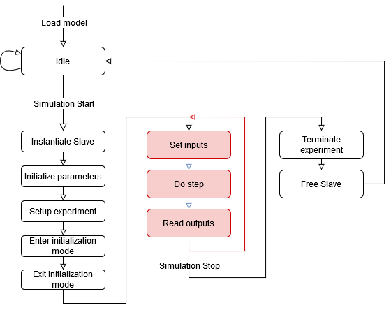 - Initialize Slave – in this step the fmi2Instantiate function is called that allocates all the necessary resources for the Slave model