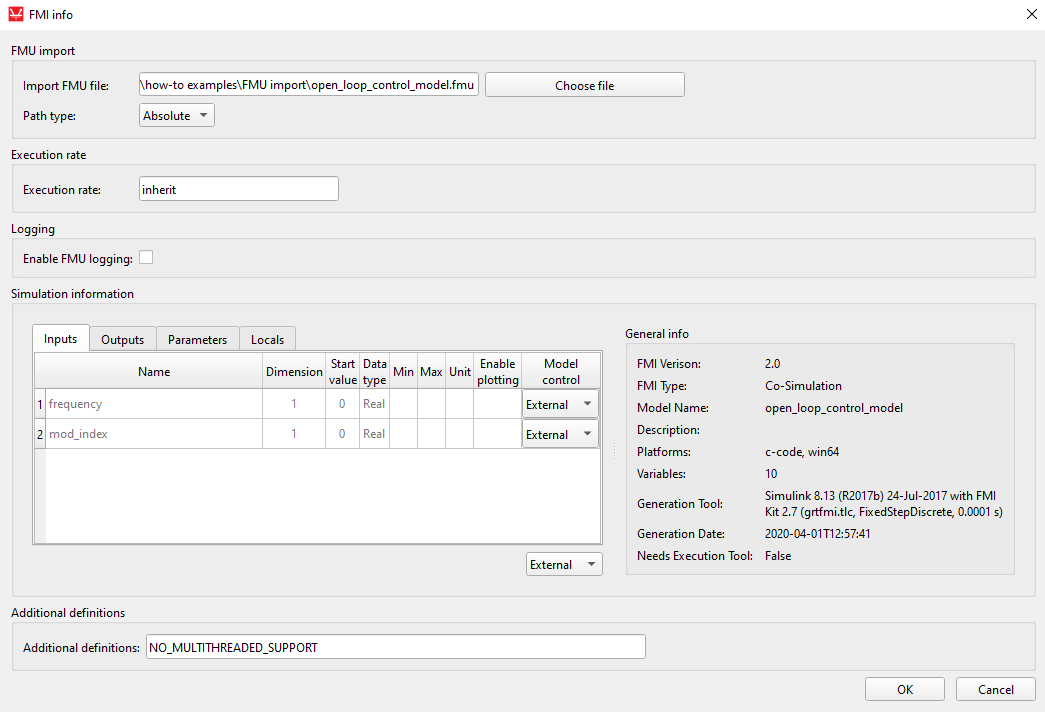 The Path type property lets you select the save format of the FMU file path. The absolute path will store the full system path to the FMU file, whereas relative path will save the path relative to the model directory. The relative path can be selected only if the model is saved first.