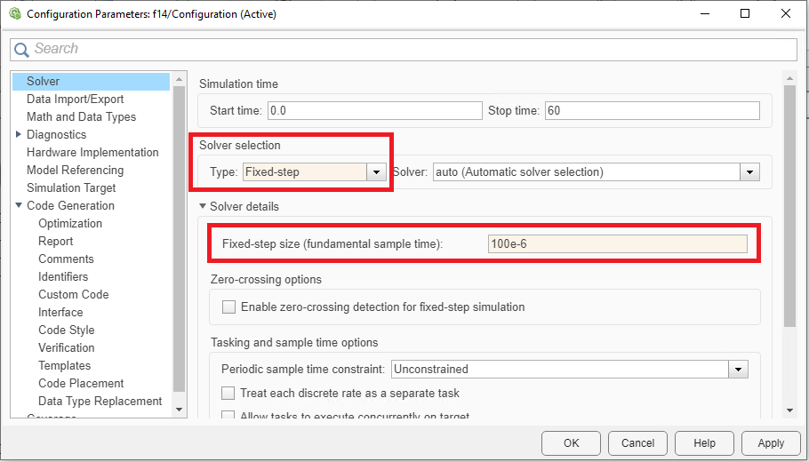 Figure 10. Model settings Figure 11. Solver settings - In order for the real-time HIL platform to be able to run the FMU model, the