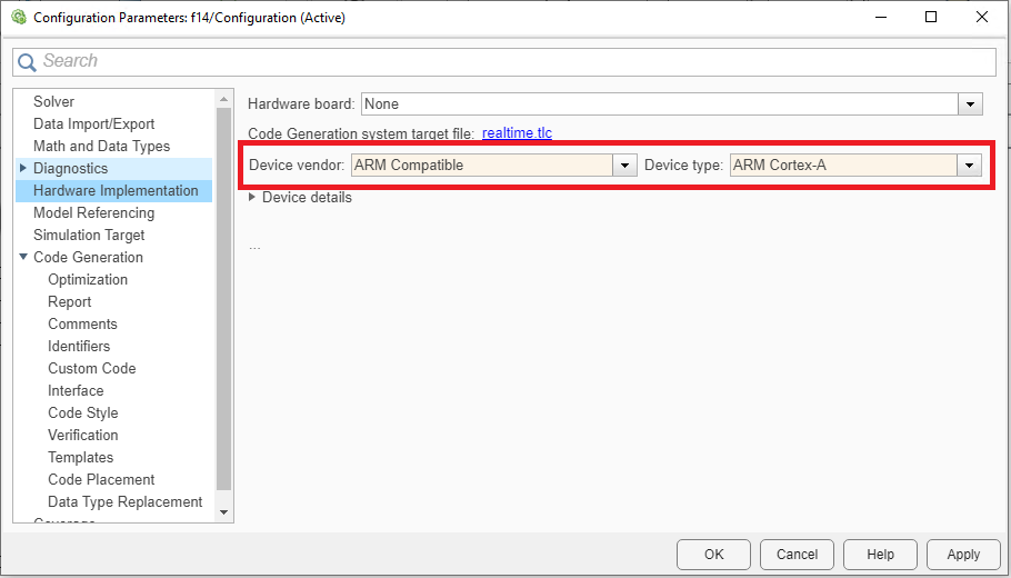 Figure 12. System target settings Figure 13. Device type settings - To export the FMU file, select Standalone FMU option in the Save drop-down