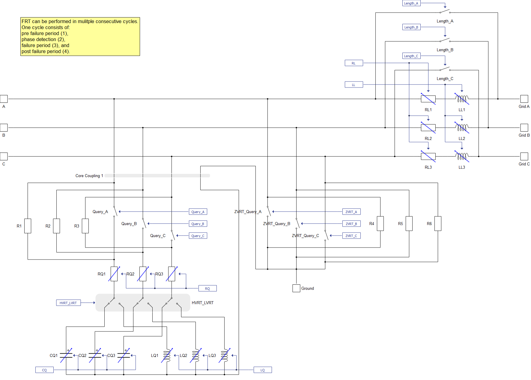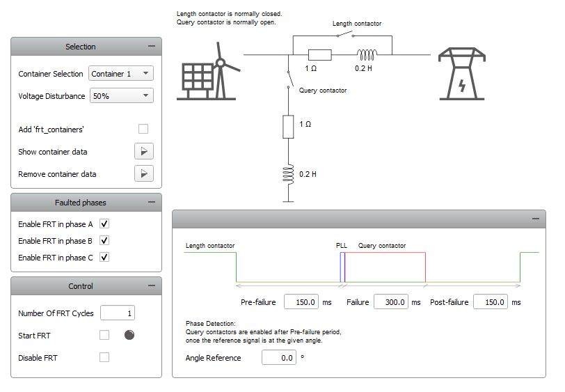 When the FRT Container is not in operating mode, both the length and the query impedances are disconnected from the remaining circuit. That is, the length contactors are normally closed, and the query contactors are normally open. During a fault ride through event, the length impedances are connected. One fault ride through period consists of three subperiods: pre-failure, failure, and post-failure. The query impedances are connected only in the failure period.