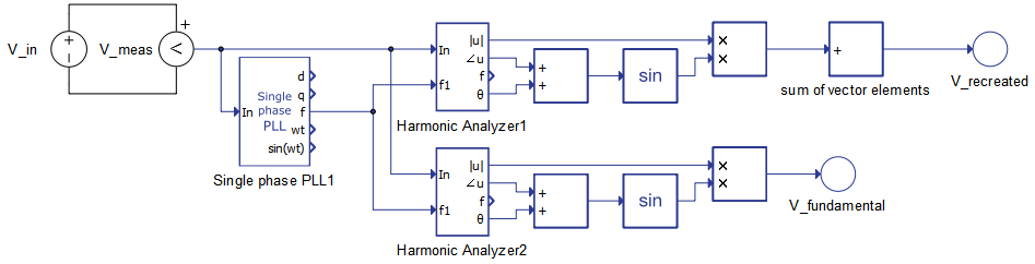 Input signal voltage is measured and provided to the Single Phase PLL component in order to acquire the fundamental frequency of the signal. Through HIL SCADA third and fifth harmonics are included in input signal. The first Harmonic Analyzer component, named Harmonic Analyzer1, is configured to extract the first, the third and the fifth harmonic, whereas the second one, named Harmonic Analyzer2, is configured to extract only the fundamental harmonic. With both of these components, the harmonic angle is added to the reference angle in order to acquire the input value for the sine calculation. Sine values are multiplied by the amplitude value. In case of vectorized signals, the Sum block sums the vector elements in order to recreate the chosen harmonics of the input signal.
