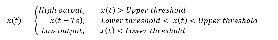 If the input signal is higher than the Upper threshold value, the output is High output value. If the input signal is lower than the Lower threshold value, the output is Low output value. If the signal is in between these values, the output does not change.