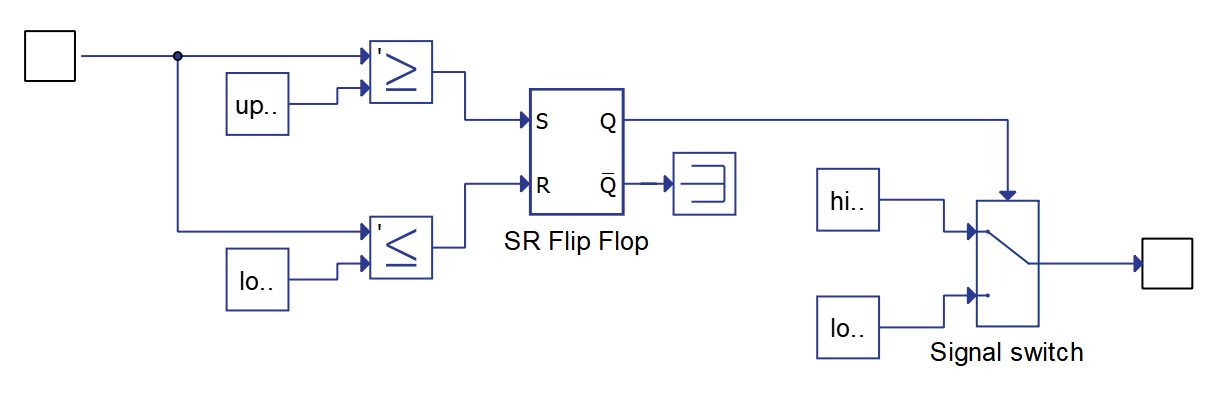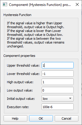 Figure 2 illustrates the behavior of the hysteresis function component if the Upper threshold is 3, the Lower threshold is -1.5 and High and Low outputs are 1 and -1, respectively. The initial value is low.