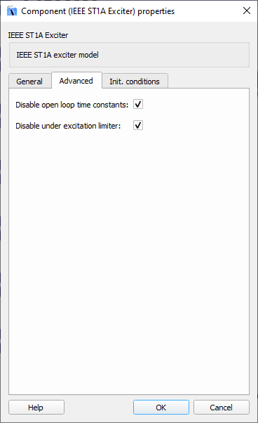 Description of the IEEE ST1A Exciter component in Schematic Editor, which represents systems in which the excitation power is supplied through a transformer from the generator terminals and is regulated by a controlled rectifier.
