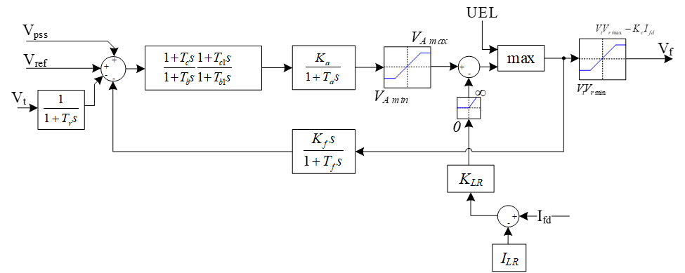 The ST1A is part of a class of fast static excitation systems. The exciter power is obtained from the machine terminal voltage via a transformer. A thyristor bridge rectifier controls the field voltage by adjusting the thyristor firing angle. A block diagram without overexcitation limiter shown in figure below where UEL represents an underexcitation limiter input. Transient gain reduction or increase, if desired, can be achieved by properly selecting values of Tc ,Tb , Tc1 , and Tb1 . For example, for transient gain reduction, Tc1 should be less than Tb1 and vice versa for transient gain increase.