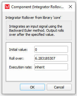 The Integrator Rollover component integrates the value of the input signal. Integrator state starts from the initial value and increases by input value multiplied by the component’s execution rate at each simulation step