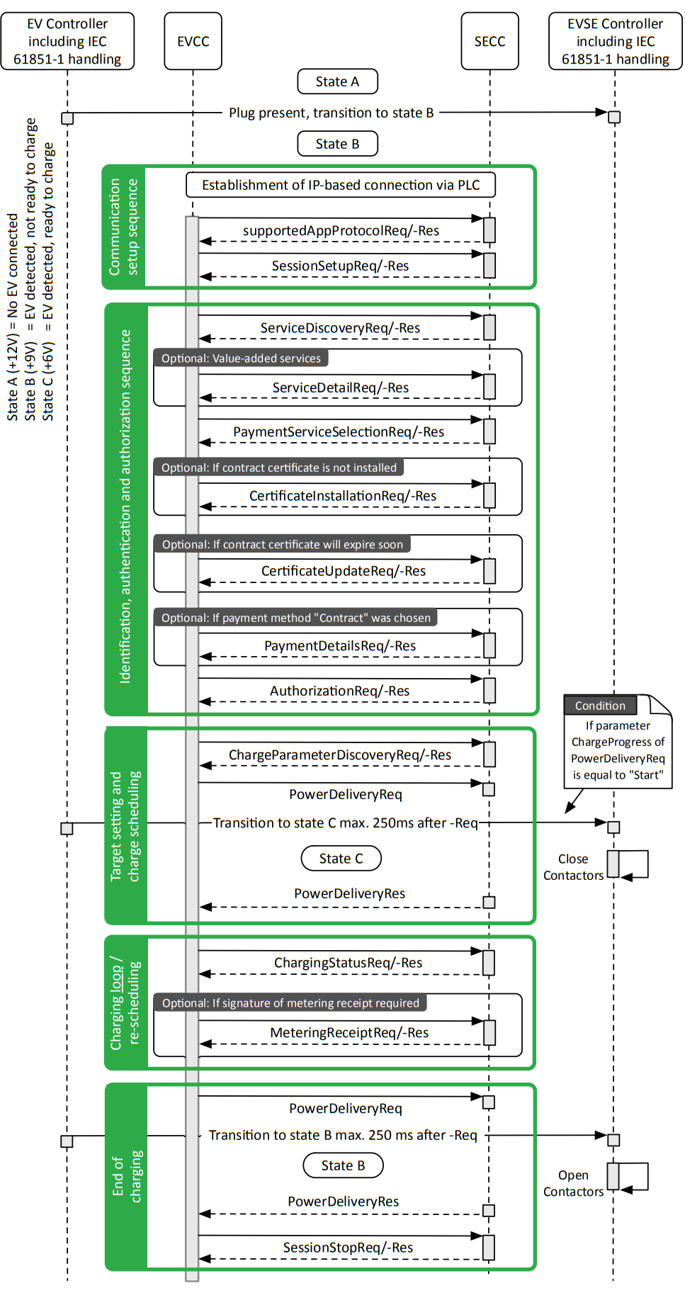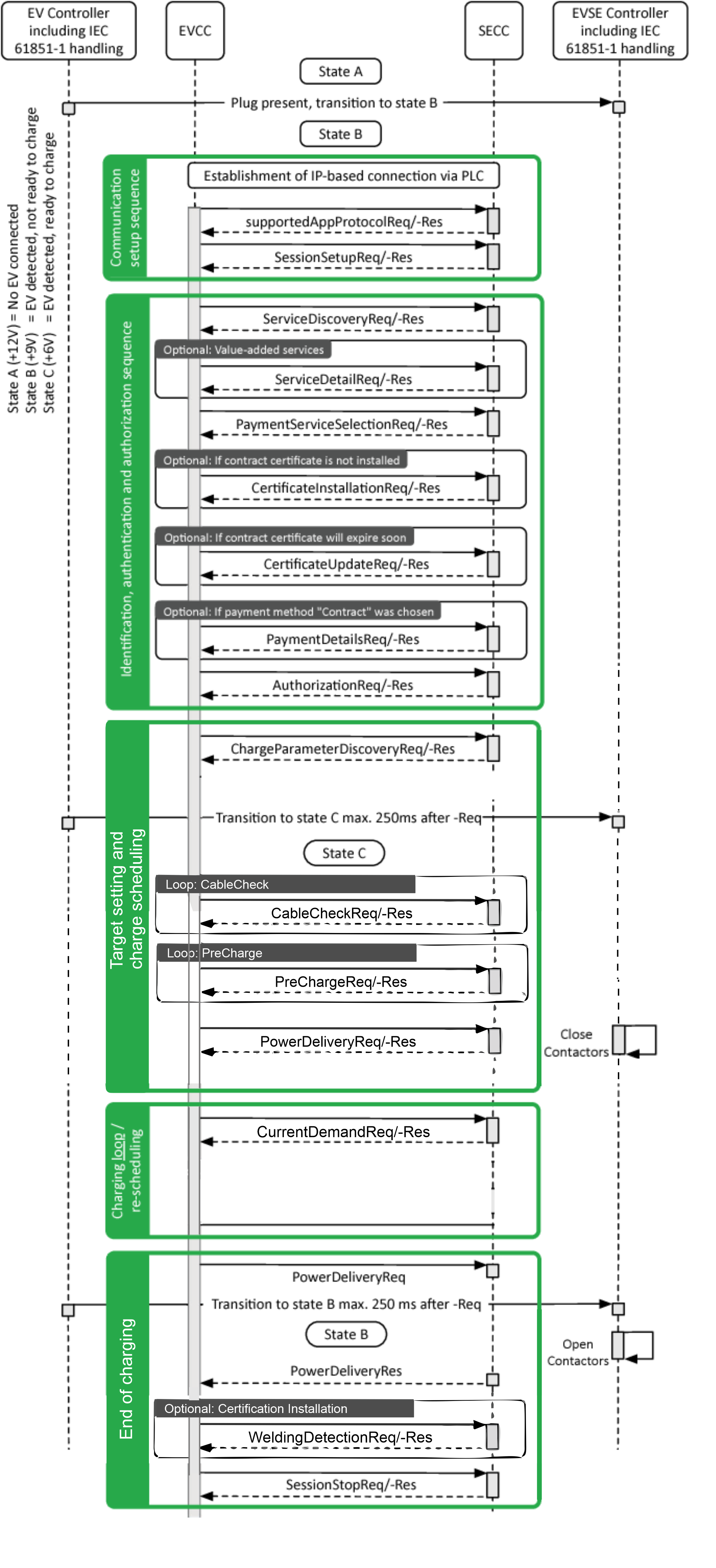 - PreCharge: Pre charge is used for adjusting the EVSE output voltage to the EV battery voltage. The EV sends the Pre-Charge Request, which contains both the requested DC current (maximum inrush current) and the requested DC voltage. After receiving the PreChargeReq, the SECC sends the PreChargeRes informing the EV about the EVSE status and the present EVSE output voltage.