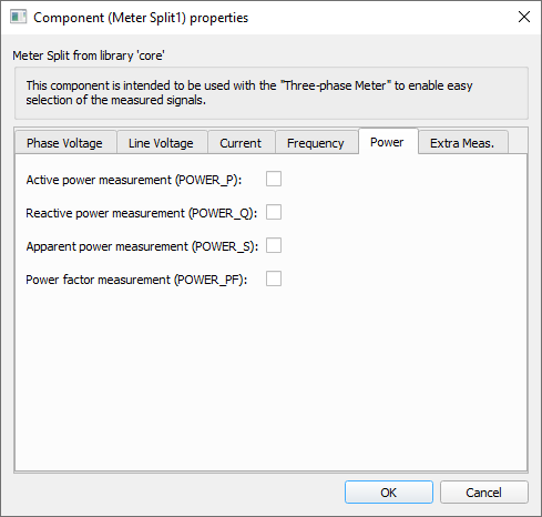 In this properties tab, the extra input port can be enabled. Consequently, the per-phase power measurement checkboxes are shown and can be enabled.
