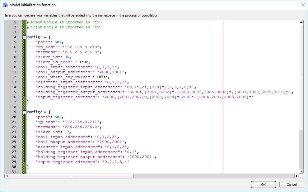 The Modbus Device configuration is defined as a Python dictionary with predefined fields. The dictionary is usually defined in the Namespace, either through a Model Initialization script or through the component mask.