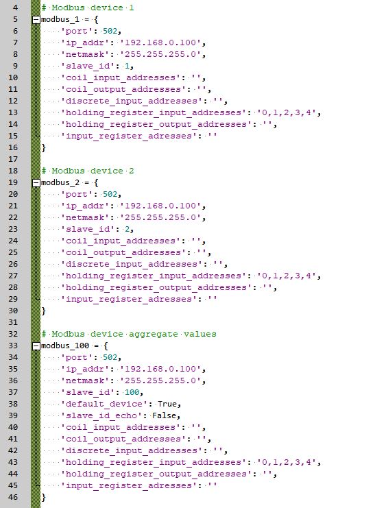 "coil_registers": { "coil_input_addresses": "0, 1, 2, 3, 4", "coil_output_addresses": "100, 101, 102, 103, 104", "coil_output_init": [1, 0, 234, -121, False] } "discrete_registers": { "discrete_input_addresses": "0, 1, 2, 3, 4" } "holding_registers": { "holding_register_input_addresses": "0u, 1i, \ [2,3]u, [4,5]i, [6,7]f, \ [8,9,10,11]u, [12,13,14,15]i, [16,17,18,19]f", "holding_register_output_addresses": "100u, 101i, \ [102,103]u, [104,105]i, [106,107]f, \ [108,109,110,111]u, [112,113,114,115]i, [116,117,118,119]f", "holding_register_output_init": [11, -12, 13, -6554, 121.98, 456696, 9998424, -564.112] } "input_registers": { "input_register_addresses": "0u, 1i, \ [2,3]u, [4,5]i, [6,7]f, \ [8,9,10,11]u, [12,13,14,15]i, [16,17,18,19]f", }