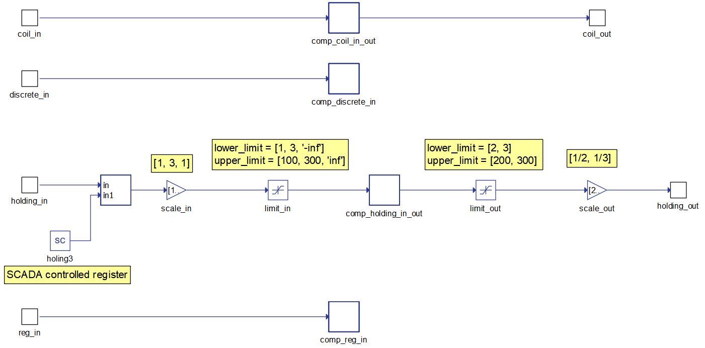 For the Holding registers, appropriate SCADA Input, Gain and Limit components are generated. SCADA Input components are generated for all the registers that are defined with scada val spec parameter (in this case holding3 register). Input scaling is performed on all in and inout registers, as well as limiting. The same is for the out and inout registers, the only difference is that the scale value is changed accordingly.