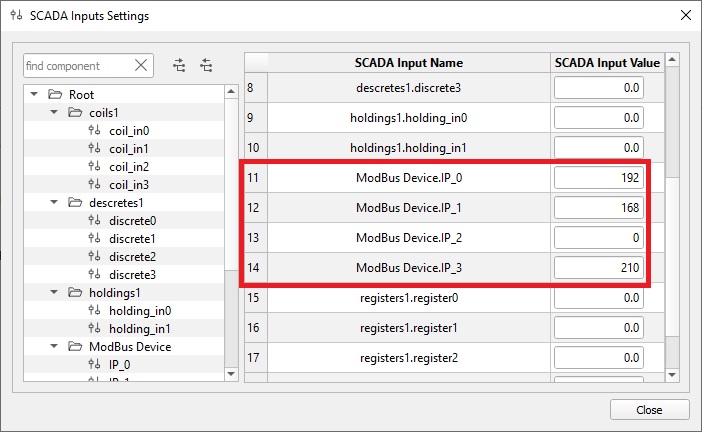 Defining Network settings through SCADA is useful if you are not sure what IPs are taken on the network. Instead of changing the settings and recompiling the model, you can change the parameters in SCADA before the simulation starts. Selecting SCADA as a parameter source will create SCADA Input components that can be accessed throug the SCADA window. This is illustrated in Figure 2.
