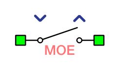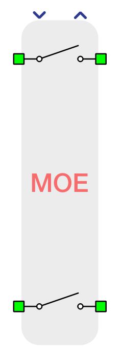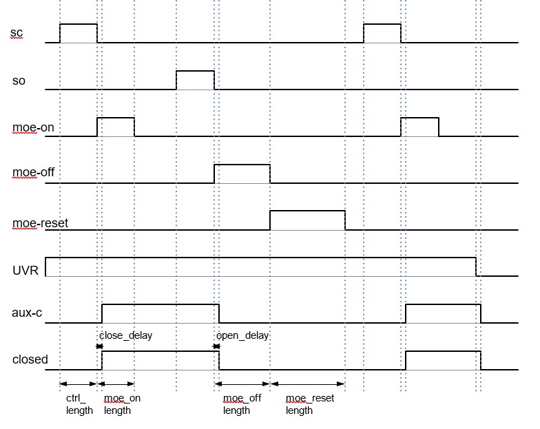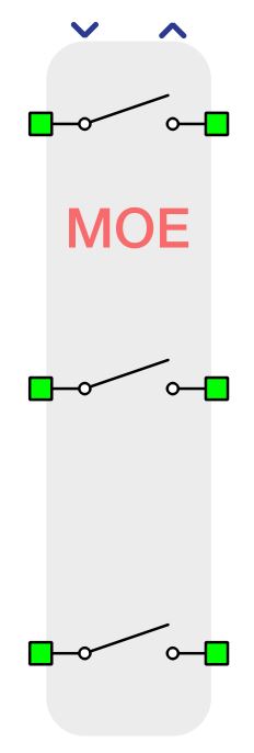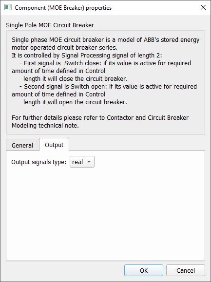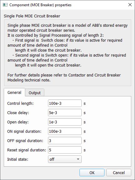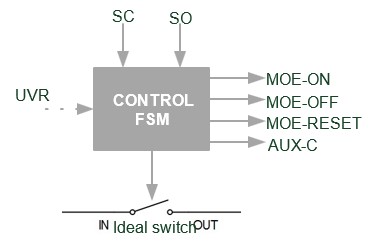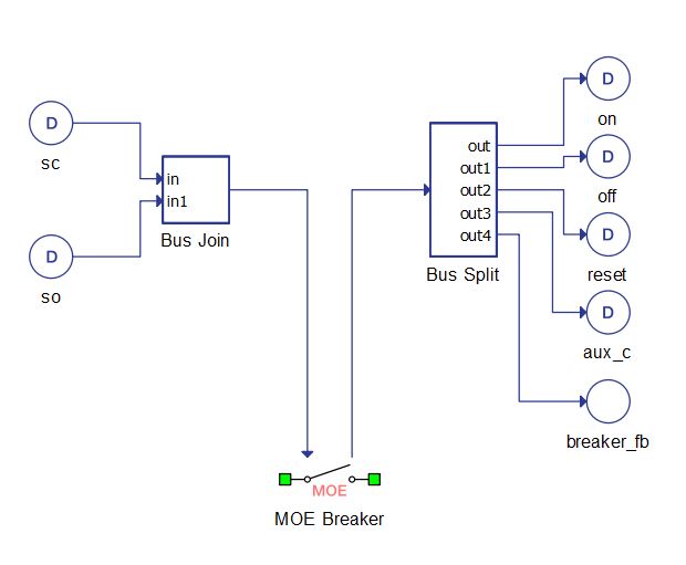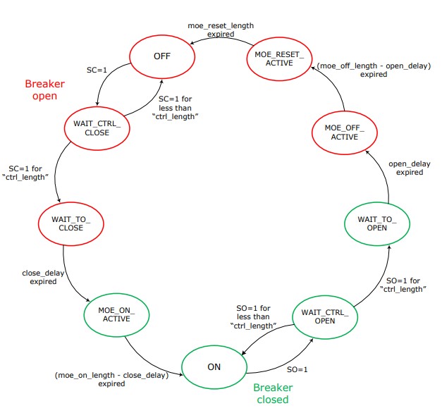 From the electrical circuit point of view, the circuit breaker element is modeled as an ideal switch. Switch state is defined by a control FSM (Finite State Machine) block (Figure 2). The control FSM features two user-defined control inputs, SC (switch close) and SO (switch open). The output signal close controls the ideal switch. There are four additional output signals used as feed backs from the circuit breakers: MOE-ON, MOE-OFF, MOE-RESET, and AUX-C.