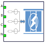 The PHIL Three Phase Current Source is a PHIL interface component used to link the real time simulation with a real power amplifier, to form a PHIL system, by means of analog input/output signals. The PHIL Three Phase Current Source component's internal structure is shown in Figure 1. It is composed of three analog input controlled voltage sources, voltage and current measurements, and a RMS calculation unit. As can be seen electrically within the simulated model, this interface component is represented by three voltage sources with series resistances. These voltage sources are defined through the analog inputs of the real-time simulator. These analog signals must be provided by the power amplifier. The analog signals that are sent to the power amplifier are the Ia_msr, Ib_msr and Ic_msr currents. These currents are the references for the power amplifier, therefore the amplifier behaves as a three phase current source.