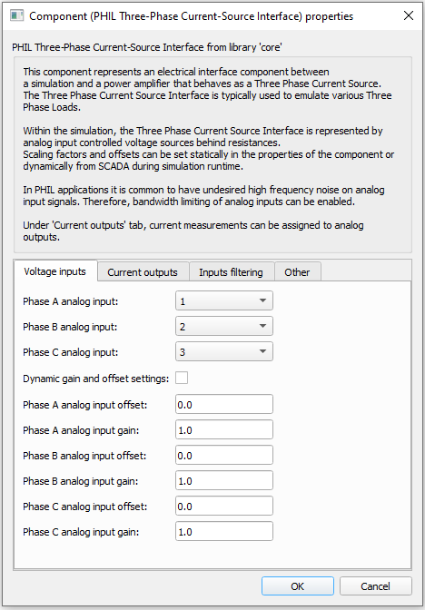This section describes the PHIL Three Phase Current Source Interface component, one of a collection of PHIL components for specific system applications. The PHIL setup where this interface component is used is a high power three-phase current-source.