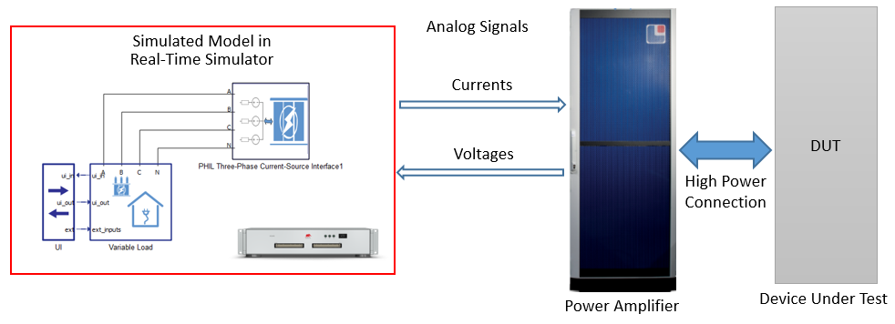 A typical use case of the PHIL Three Phase Current Source Interface is in a Three Phase Load Emulator PHIL system (Figure 2). In this system, a load defines the current that it consumes, therefore behaving as a current source. The three phase load is simulated by the real-time simulation. The load currents are measured and fed to the power amplifier's analog inputs through the real-time simulator’s analog outputs. Voltages measured by the power amplifier on its high power terminals are provided to the real-time simulation through analog inputs.