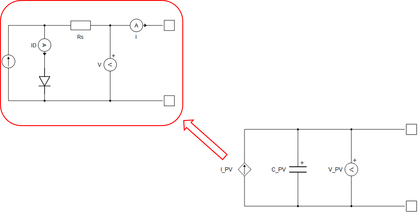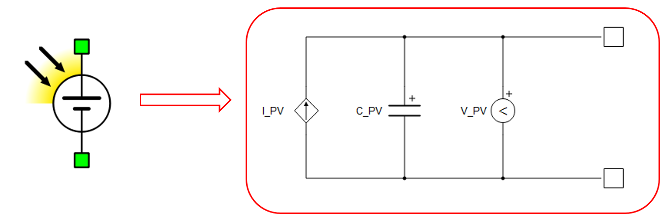 The photovoltaic panel element is modeled as a voltage-controlled current source I_PV with module capacitance C_PV connected in parallel, as shown in Figure 1. The current source I_PV is controlled by the voltage V_PV across the PV panel, in combination with a predefined PV model I-V curve.