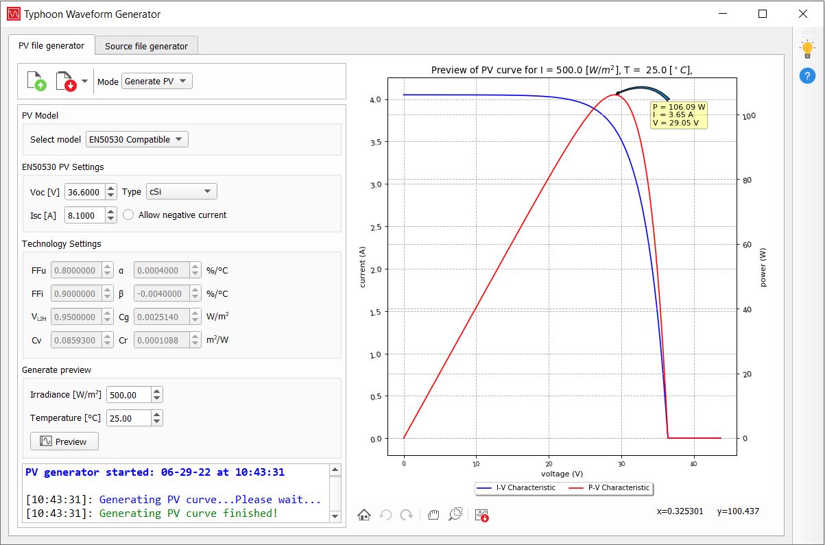 - Shows IV curve based on the file specified with EN50530 Compatible parameters file and ambiental settings