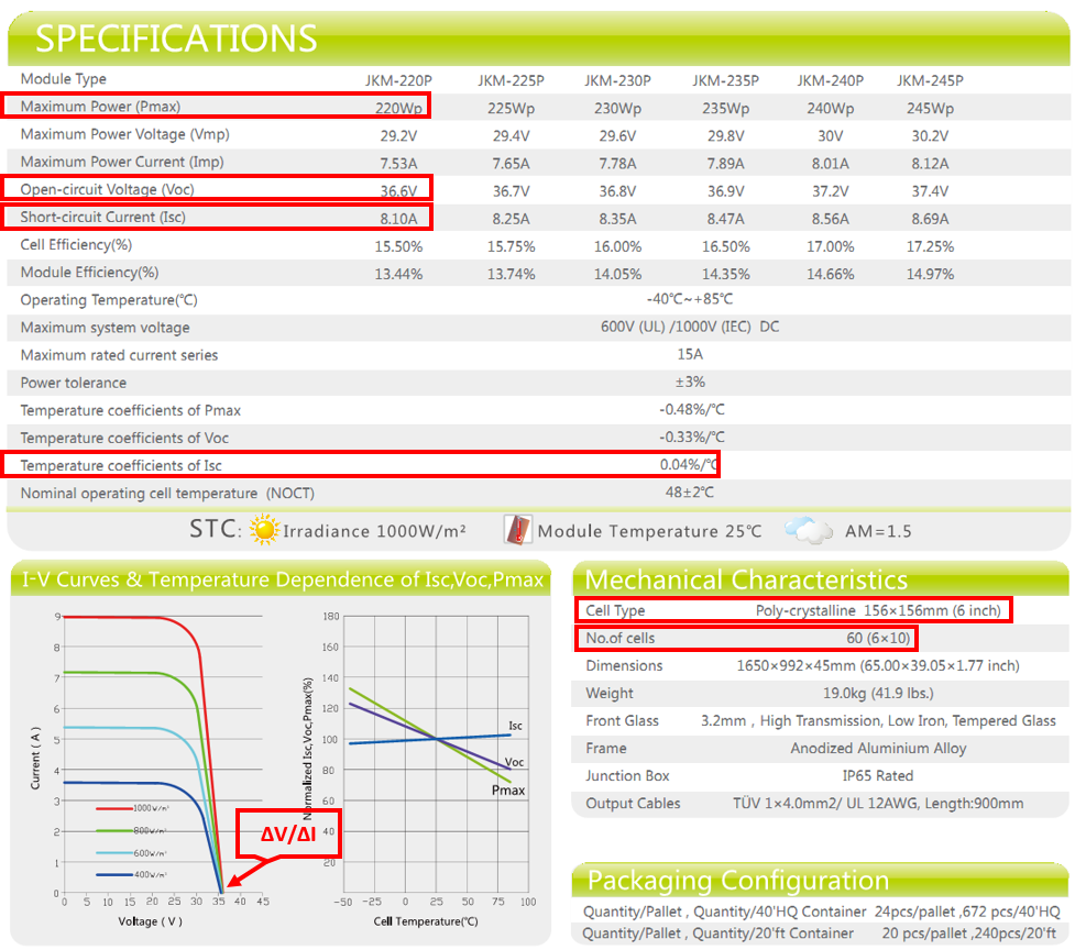 - ∆V/VI at Voc - slope of the U/I characteristic at Voc operating point (product U/I curve)