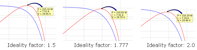 The next steps describe how to determine the ideality factor for a given PV panel. It cannot be read directly from the datasheet, rather it has to be determined experimentally. After entering all the available parameters from the datasheet to the Waveform Generator, an initial value for the ideality factor should be chosen. A good initial guess for crystalline silicon is around 2, while for amorphous silicon is less than 2. Finally, the maximum power displayed on the graph in the Waveform Generator should be compared to the maximum power provided in the datasheet. This process should be repeated until a close enough match between the maximum powers from the PV curve preview and the datasheet is obtained. PV curves for several ideality factors are shown in Figure 6.