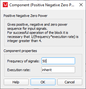 The component takes phase voltages and currents of the three-phase circuit and outputs the powers of positive, negative and zero sequences of that circuit.
