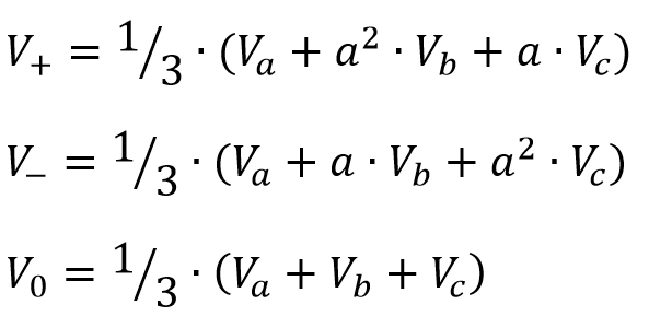 Input voltages and currents are transformed from time to complex domain first. After that, the positive negative and zero sequence phasors are calculated for both sets of values by using symmetrical components transformation: