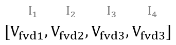 There are a few general rules for creating conduction loss Look-up Tables. When using 1D lookup tables, the current values are on the x-axis. An example of a general 1D lookup table for current values [I1, I2, I3, I4] is shown in Figure 3. This figure shows that the forward voltage drop Vfvd1 is related to current I1, Vfvd2 to current I2, and so on. An example of a general 2D lookup table for current values [I1, I2, I3, I4] and temperature values [T1, T2] is shown in Figure 4. In this case, the forward voltage drop Vfvd1 is related to current I1 and temperature T1; Vfvd2 is related to current I1 and temperature T2; Vfvd3 to current I2 and temperature T1; and so on.