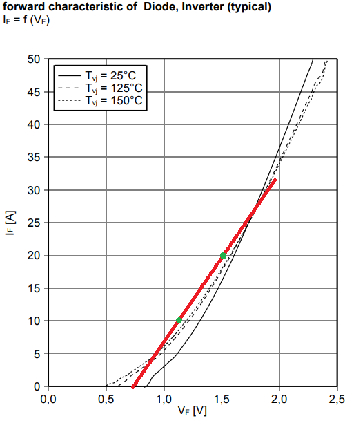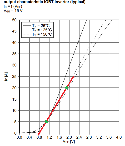In the following figures, characteristics are given for three temperatures (25℃, 125℃ and 150℃). It is important to first define the right temperature from which conduction loss parameters will be extracted. Usually this is the highest working temperature where the losses are maximized. The temperature dependance of conduction loss parameters is not modeled. Red lines represent the linear approximation of the given curves from the datasheet. The slope of these curves represent the resistance parameters (Rce for the IGBT and Rd for the Diode). The values for points where these curves cross the zero current are voltage parameters (Vce for IGBT and Vd for Diode).