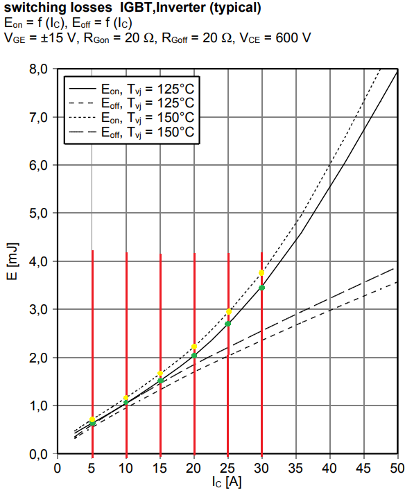 Figure 7, Figure 8, and Figure 9 represent switching losses characteristics extracted from component datasheet. Green dots represent values for 125℃ and yellow dots are for 150℃ . These values are used to fill the lookup table fields.