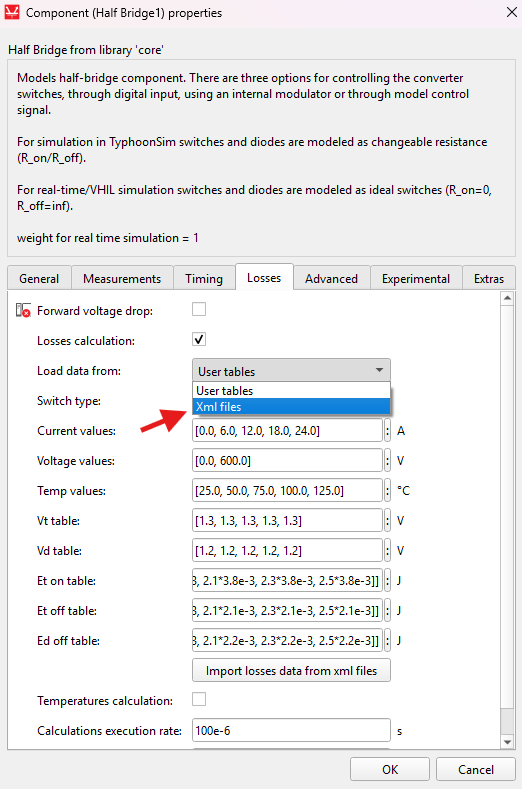 User tables needs to be selected from Load data from combo box in order to load the data manually. Clicking the Import losses data from xml files will fill the properties with data from xml files. Properties won't be set if the files contain data in any format other than Table only. The Typhoon HIL implementation of power loss data assumes the same current, voltage, and temperature vectors for all imported power losses tables. Sometimes the Switch (IGBT or MOSFET) and Diode vectors, can be slightly different because they are located in different files. When this is the case, the Switch vectors have priority for loss calculation. This means that any Diode vectors that are different will be substituted with vectors from the Switch element, and the Diode losses tables will be recalculated according to these newly assigned vectors when data is imported from xml files. Of course, if converters or switching groups inside the converter consist of only Diode elements, vectors and tables from Diode XML files will be used without any additional changes or table recalculation. User and XML data can be loaded independently and switching between Xml files and User tables will also switch which losses data is used.