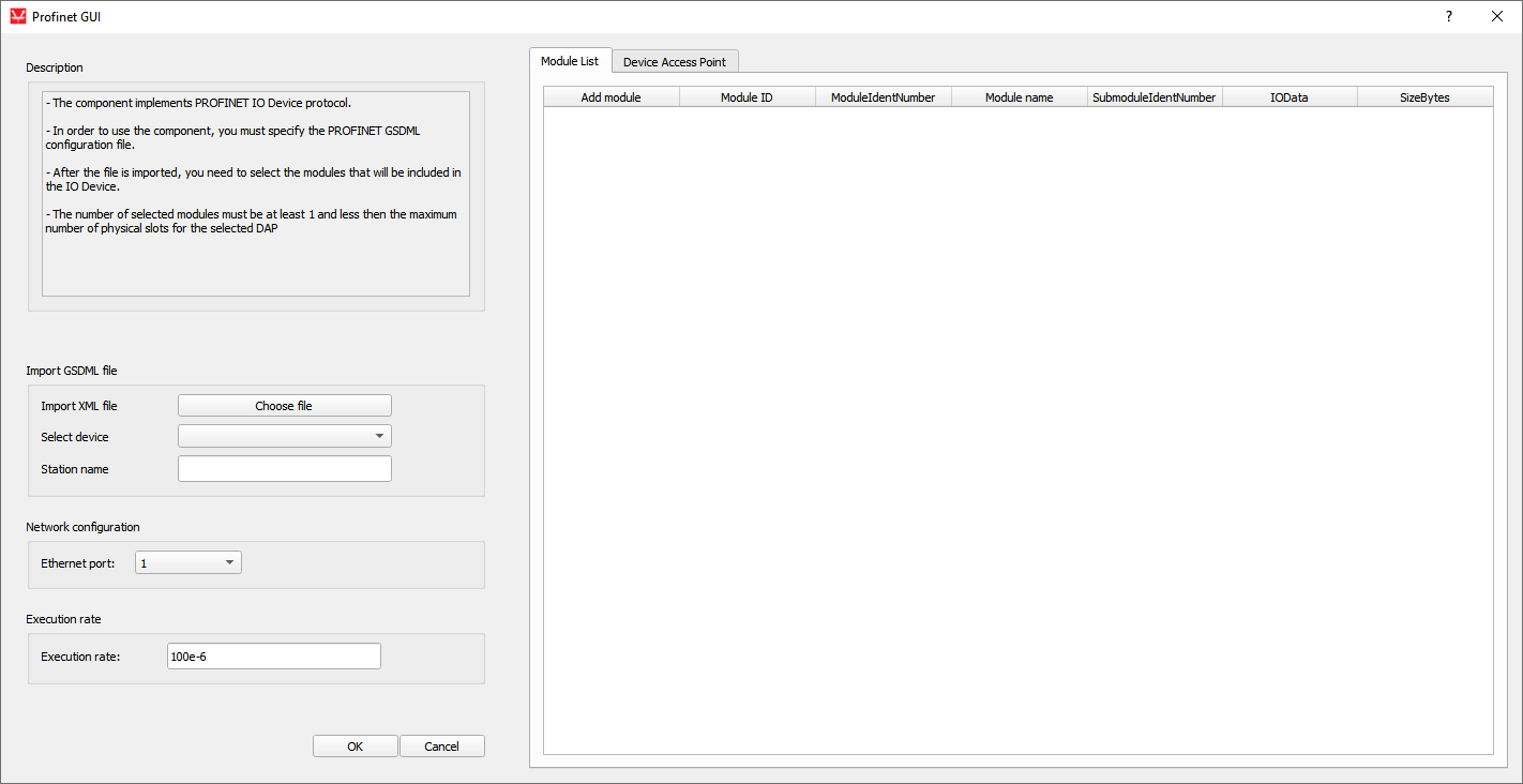 The IO Device configuration is specified in GSDML files. Pressing the button opens the file browser window to select the desired configuration file. After the successful file import, the Select device values are updated as well as Module List and Device Access Point tables.