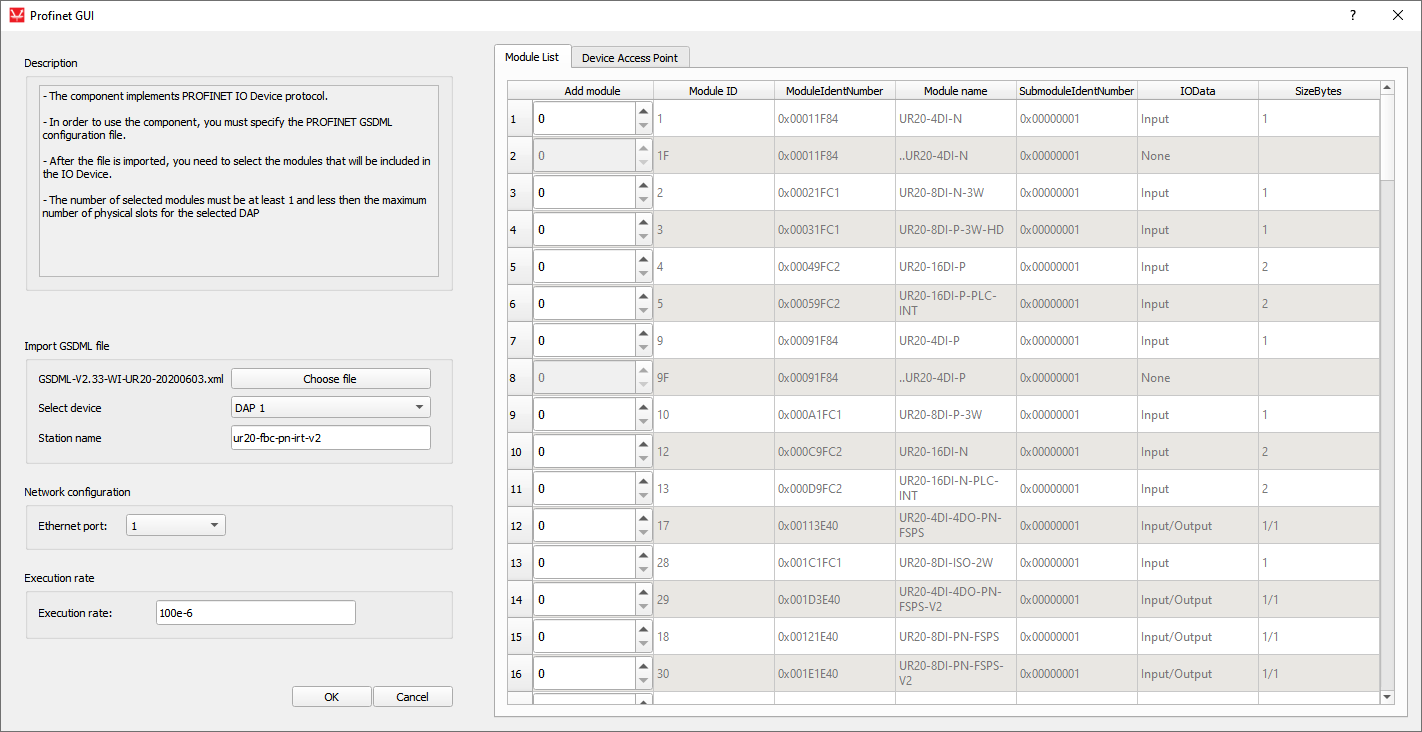 Modules are added by defining the number of Modules. Every Module has subslots where Submodules are placed. Submodules can be virtual or real. If a GSDML file is imported with virtual Submodules, the IO Device will parse the file and create the Module List and Device Access Point tables, but only the Modules will be listed and not the Submodules that could be inserted in the existing Modules.